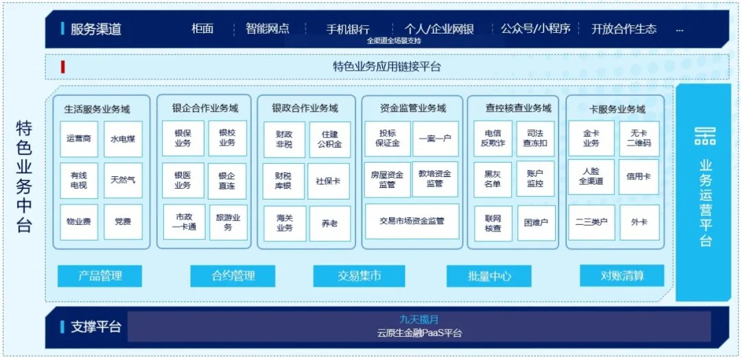 一方面,通过技术架构的重塑和改进,引入分布式、微服务等技术架构理念,更加高效的支撑包括:跨境结算、三方缴费、三方租赁、信托、代理业务及其他特色业务/中间业务的创新需求。另一方面,融合产品化运营理念,通过对应的特色业务中台建设,为银行搭建符合应用现代化工艺流程的特色业务研发及运营平台,标准化落地业务资产,全面支撑银行“+千行百业场景”业务建设。